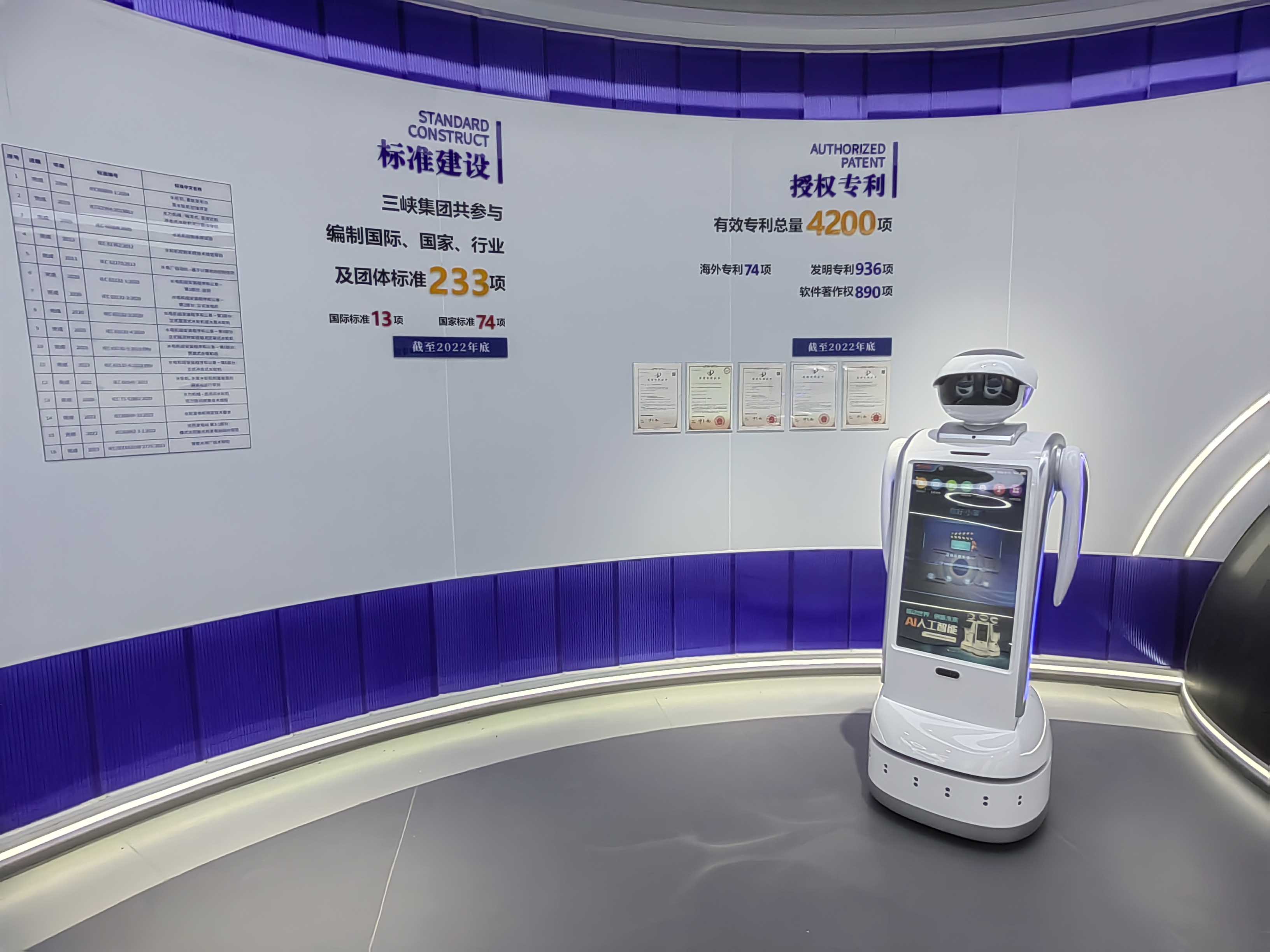 在三峡集团科创展厅,永信贵宾会智能给出了别具一格的智慧服务新方案,AI机器人通过语音交互技术,全面呈现三峡建设的故事和意义;通过智能导览技术,轻松引导访客了解三峡展厅的布局;通过万物互联技术,提升三峡展厅的参观科技感等。